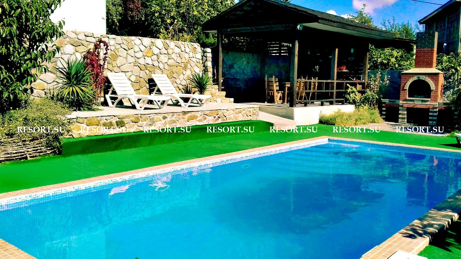 Во дворе: летняя кухня, бассейн, парковка для машины.