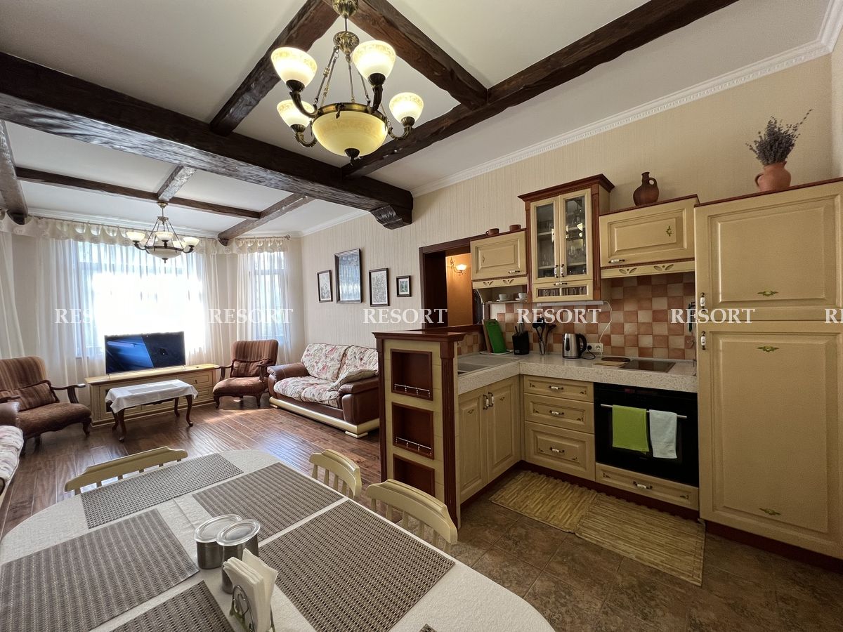 Современная мебель из массива дерева, пол деревянный, отделка класса люкс, бытовая техника и много разных полезных и приятных мелочей.