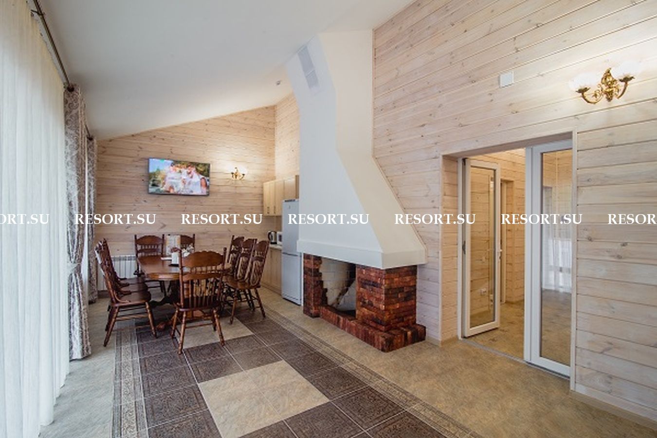 - каминный зал с пространством для отдыха, большим столом и террасой с джакуззи