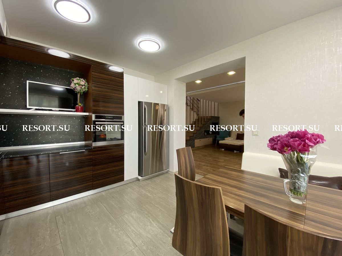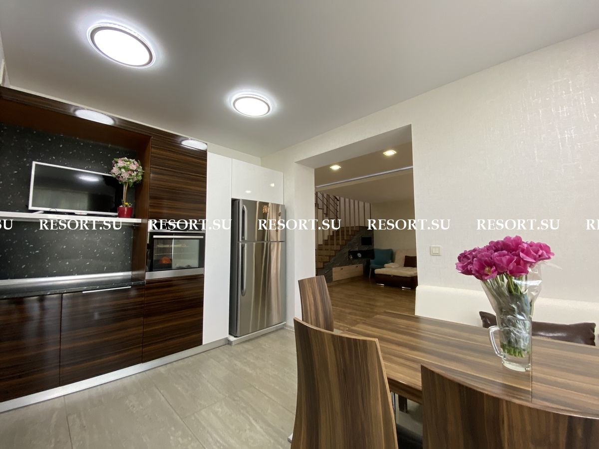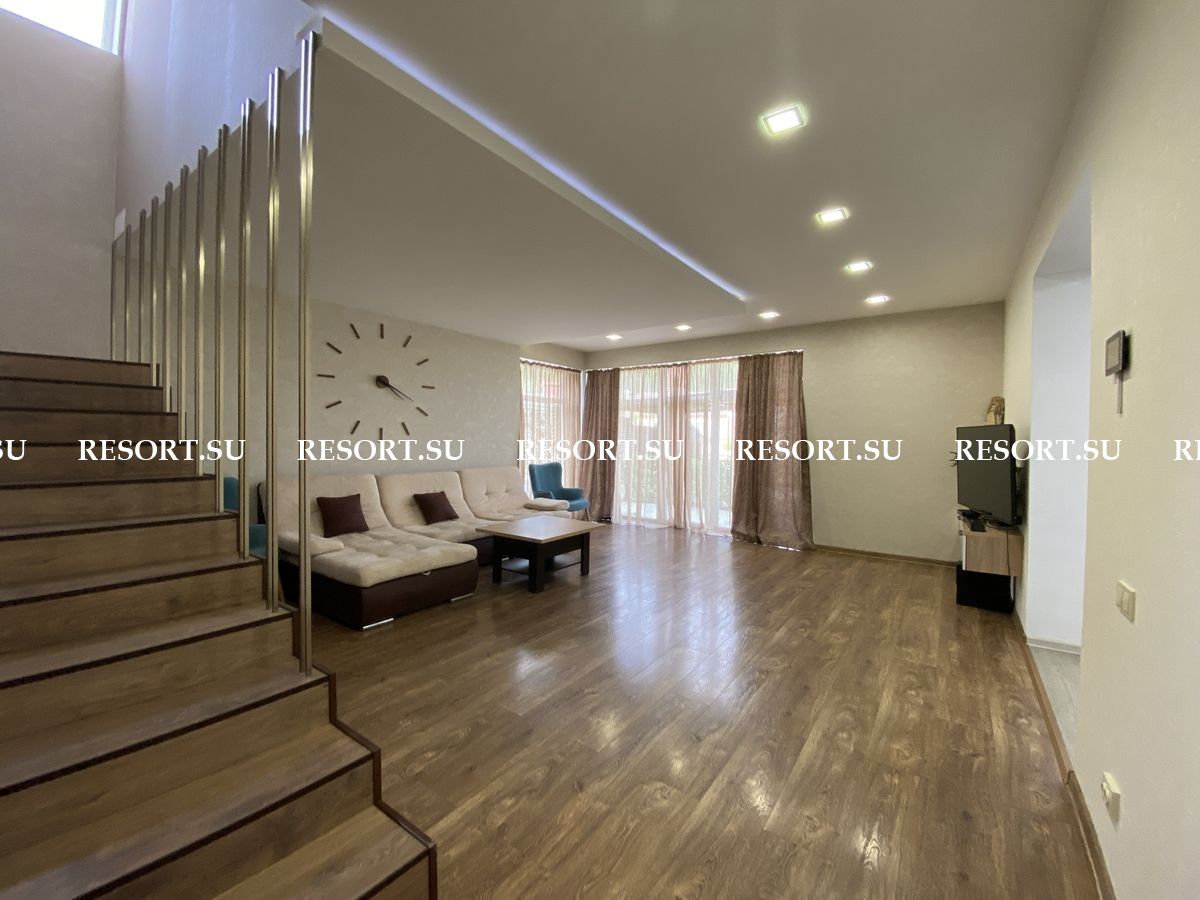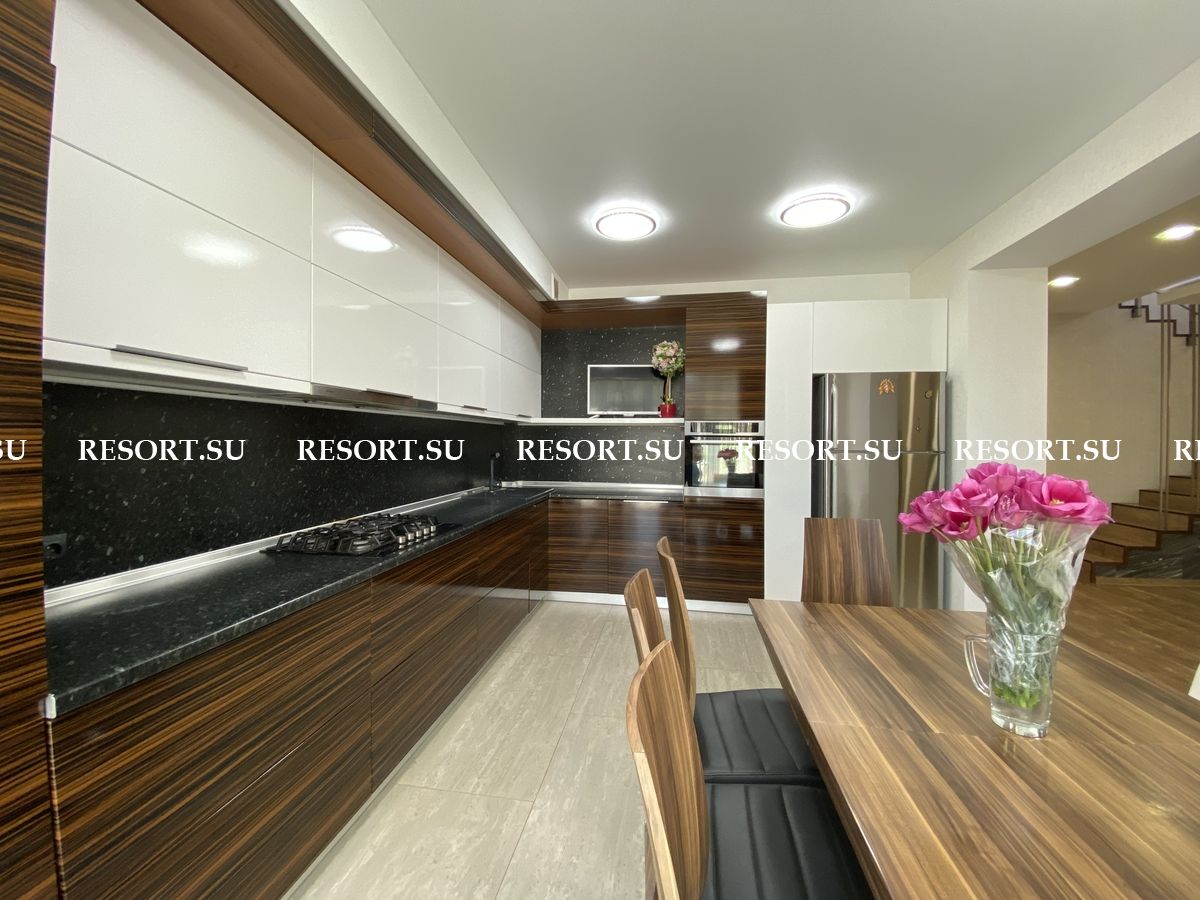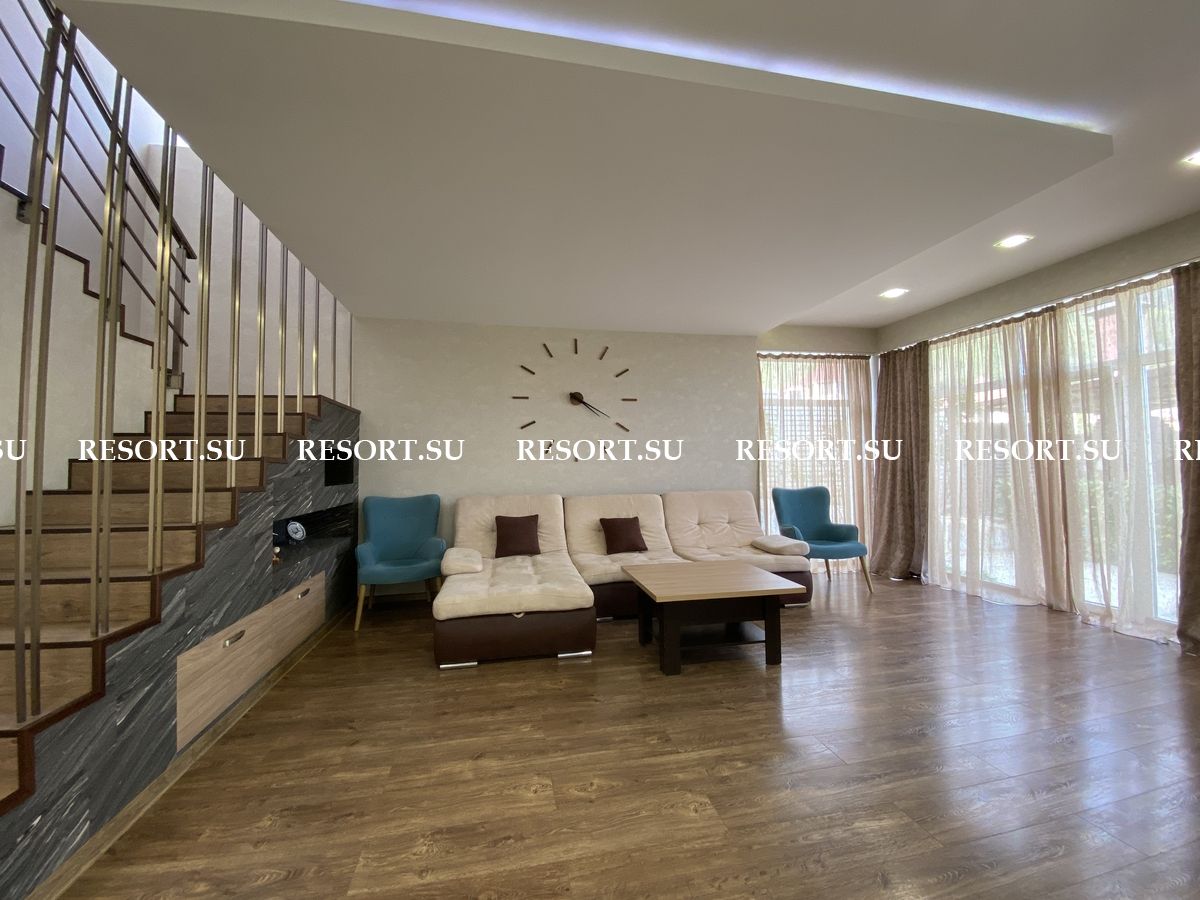 Первый этаж - просторная гостиная с большим плазменным телевизором; кухня со встроенной бытовой техникой - посудомоечная машина, духовка, варочная поверхность; хозяйская спальня с двуспальной кроватью.