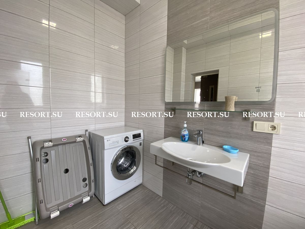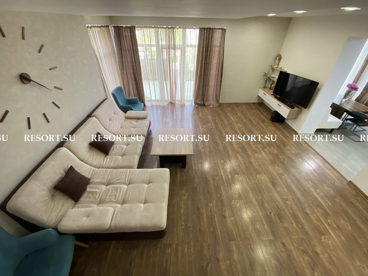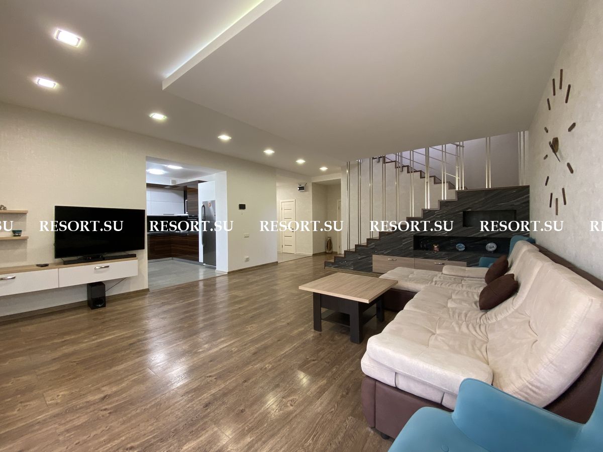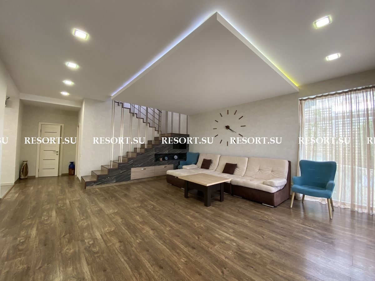 Первый этаж - просторная гостиная с большим плазменным телевизором; кухня со встроенной бытовой техникой - посудомоечная машина, духовка, варочная поверхность; хозяйская спальня с двуспальной кроватью.
