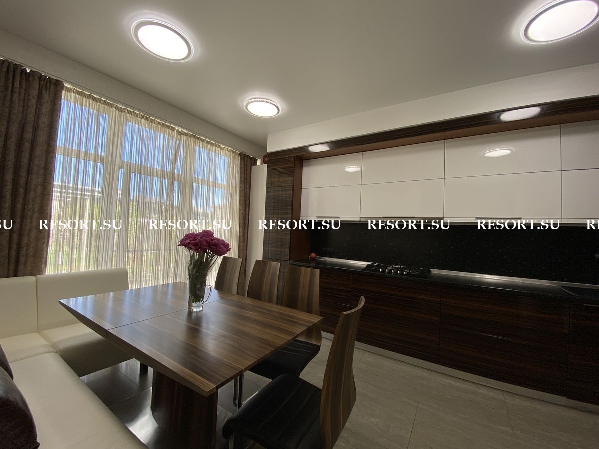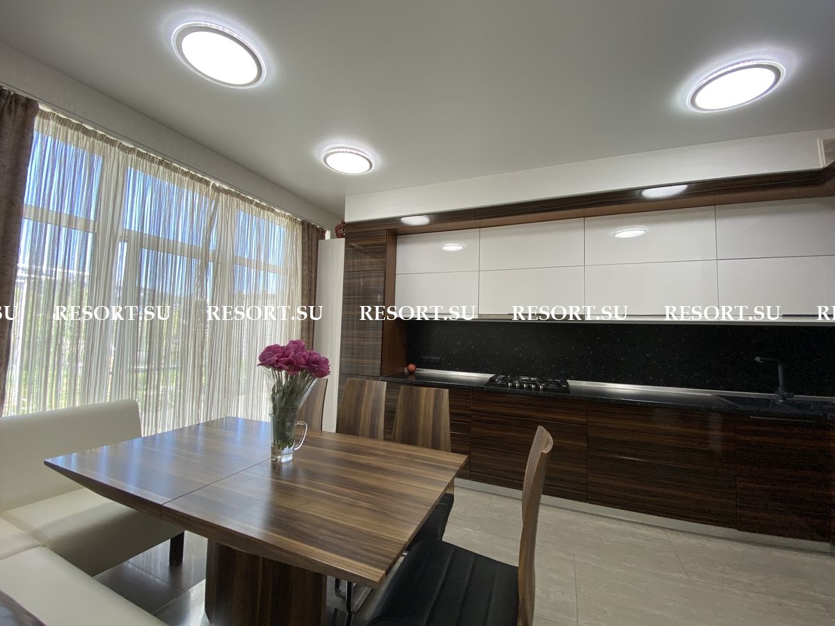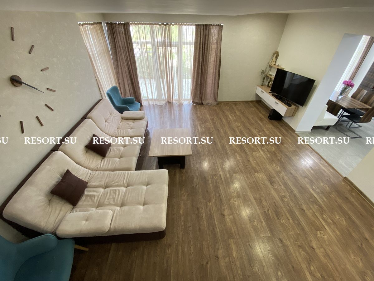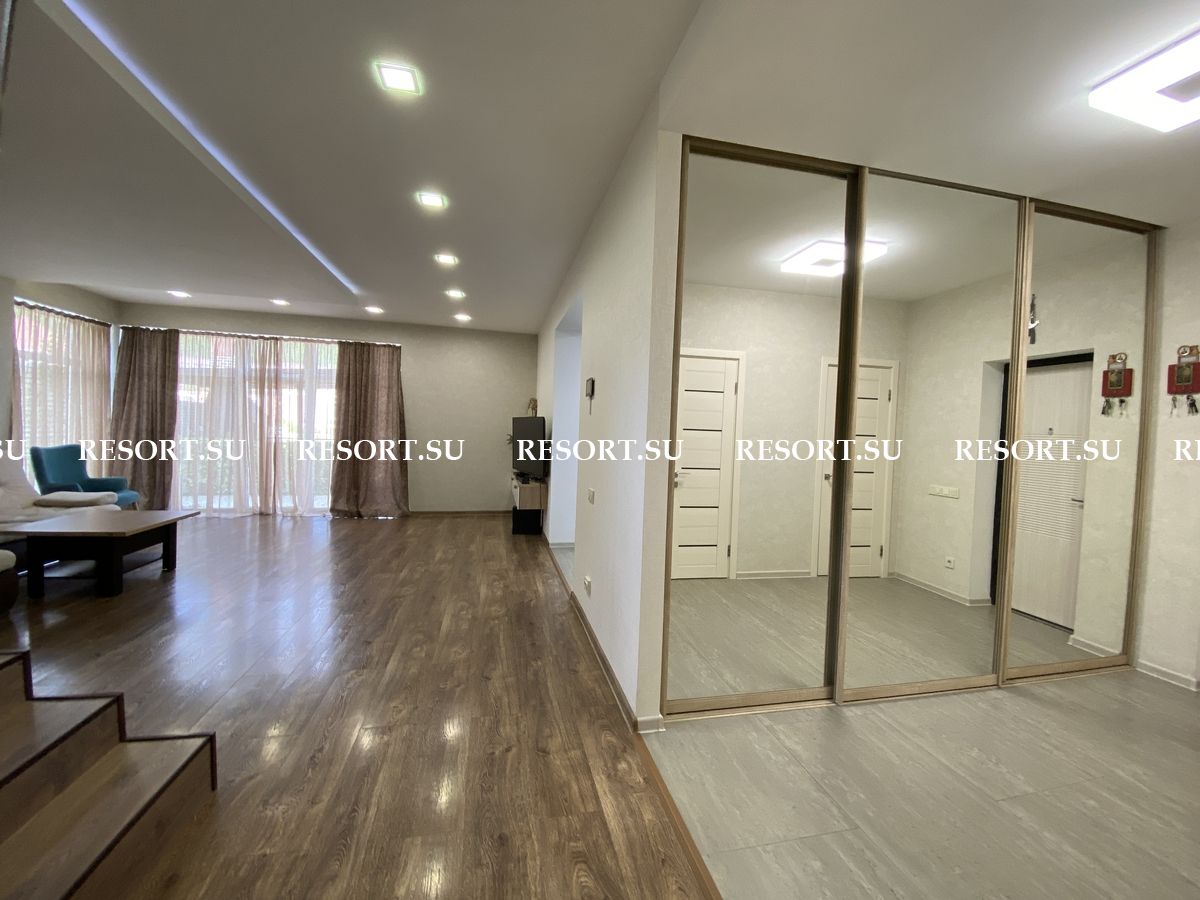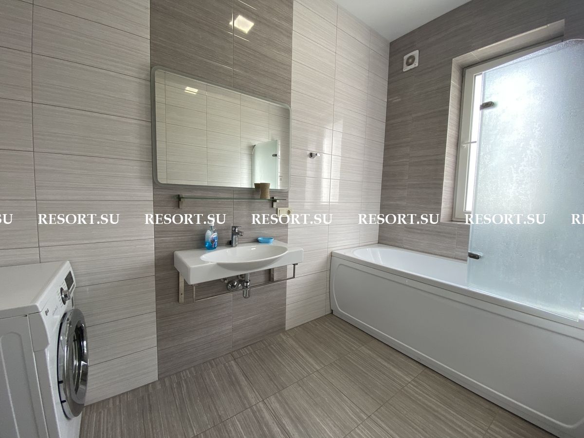Первый этаж - просторная гостиная с большим плазменным телевизором; кухня со встроенной бытовой техникой - посудомоечная машина, духовка, варочная поверхность; хозяйская спальня с двуспальной кроватью.