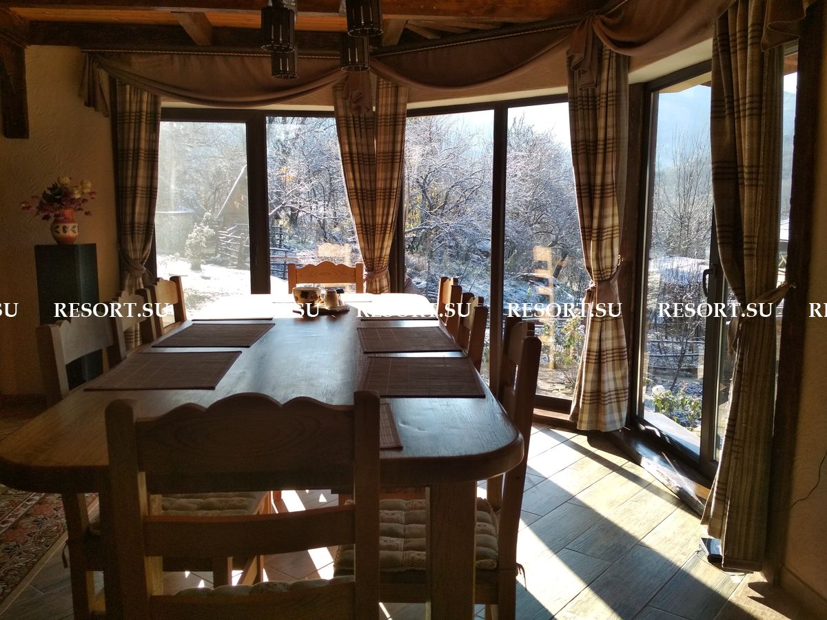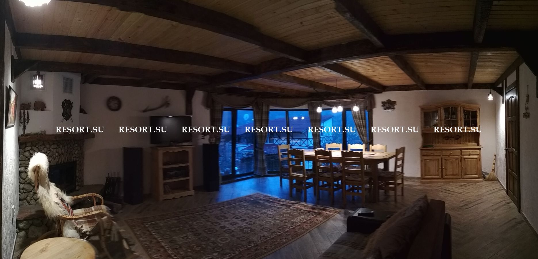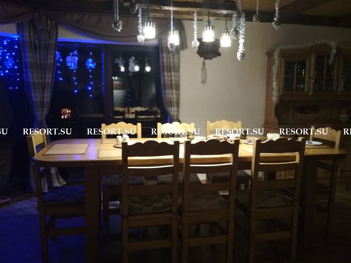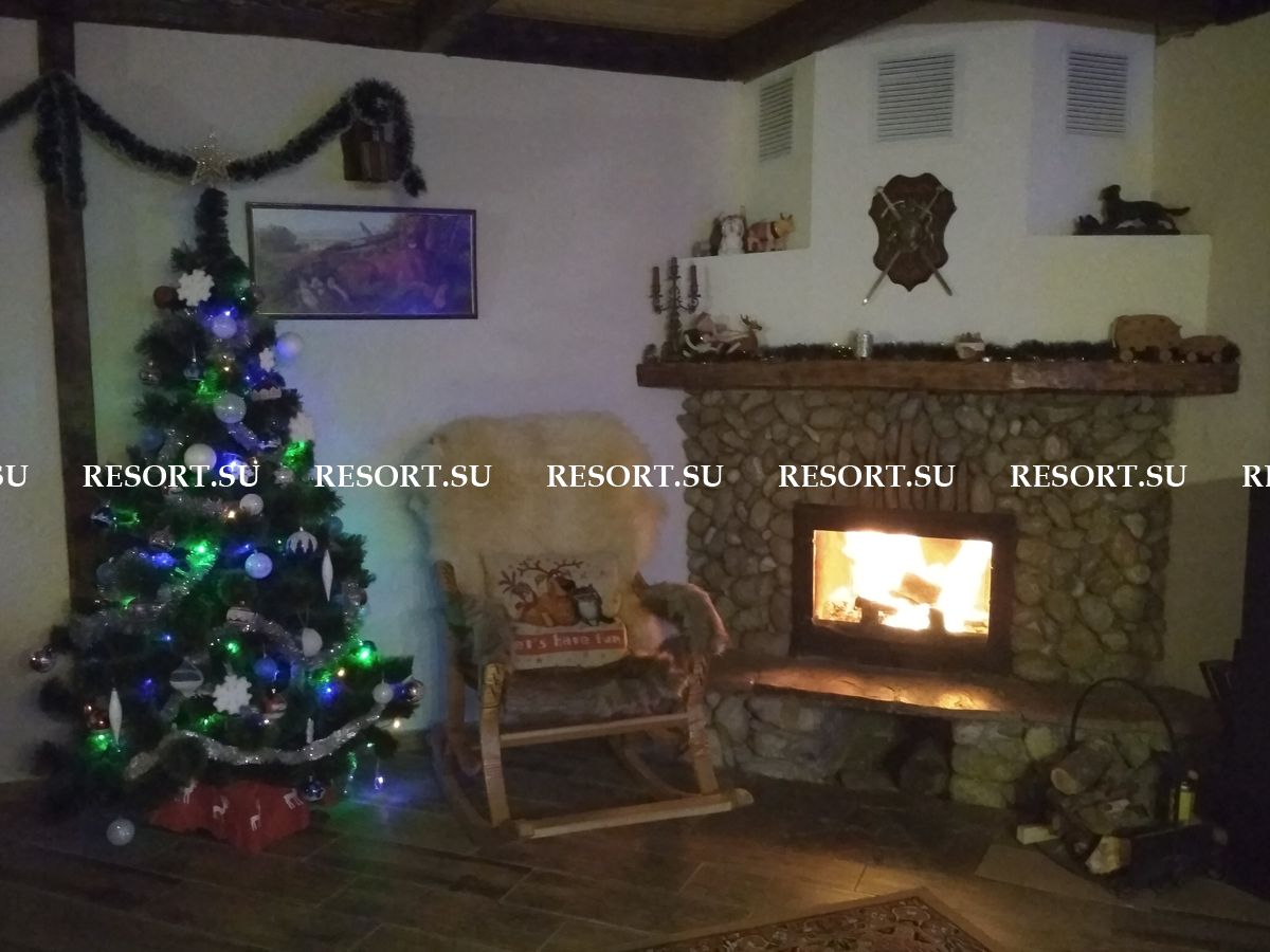 На первом этаже каминный зал площадью 40 квадратных метров с большим дубовым обеденным столом, мягкой мебелью. Большие окна обеспечивают панорамный вид на горы. Телевизор со спутниковой антенной обеспечивает широкий выбор российских и украинских каналов. Мощная акустика, DVD-плейер.