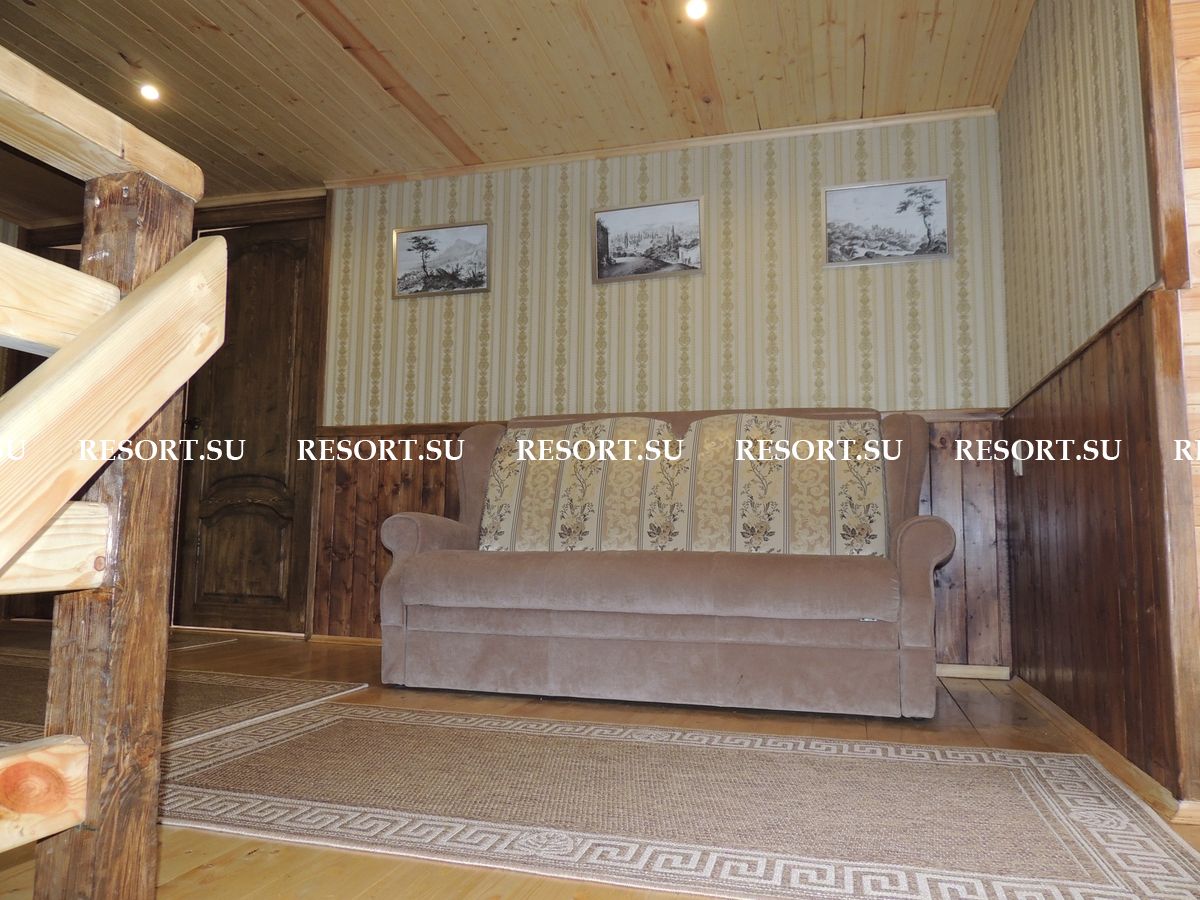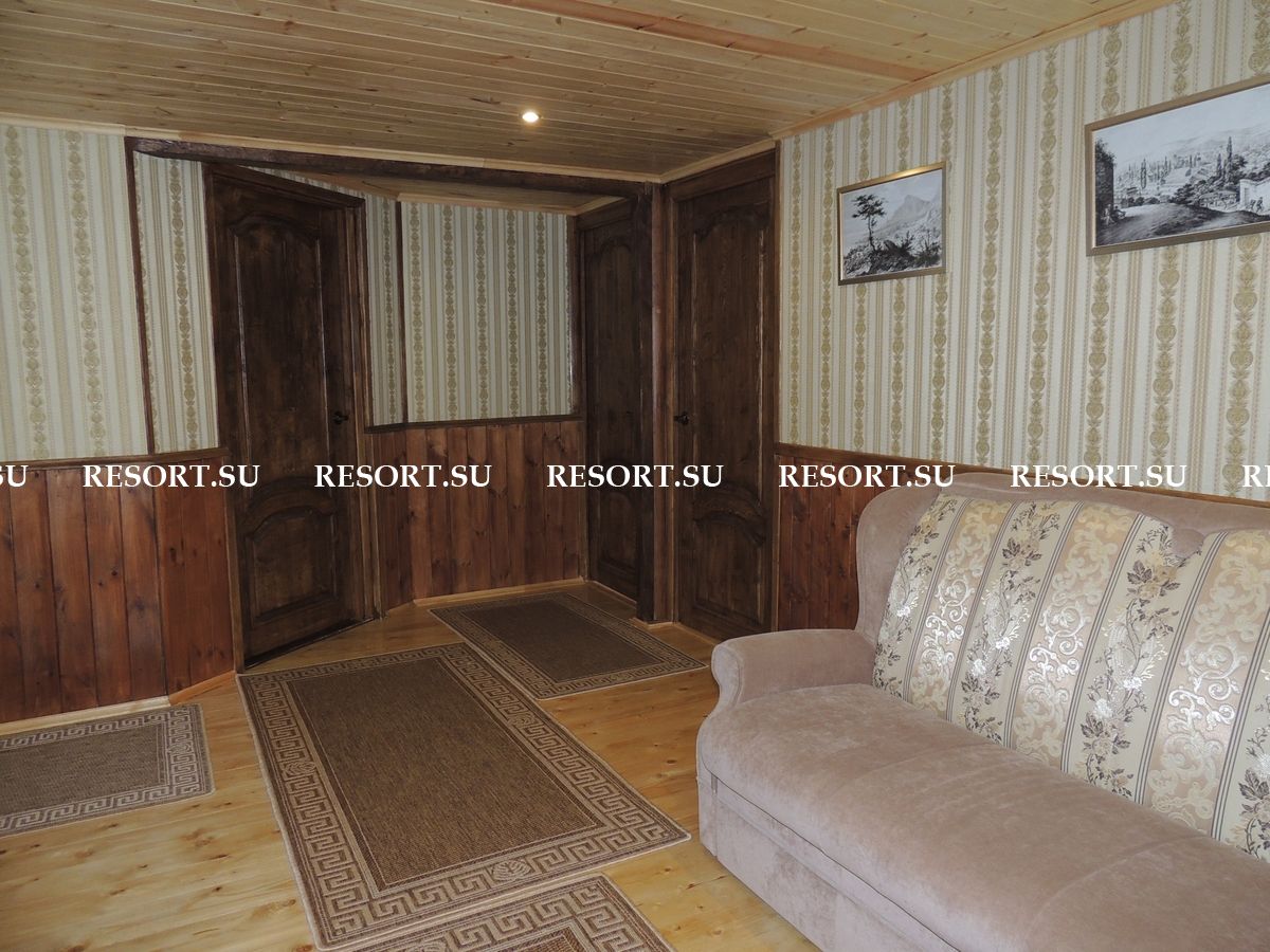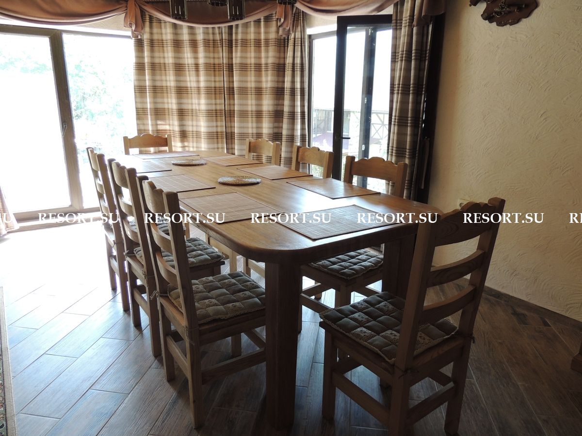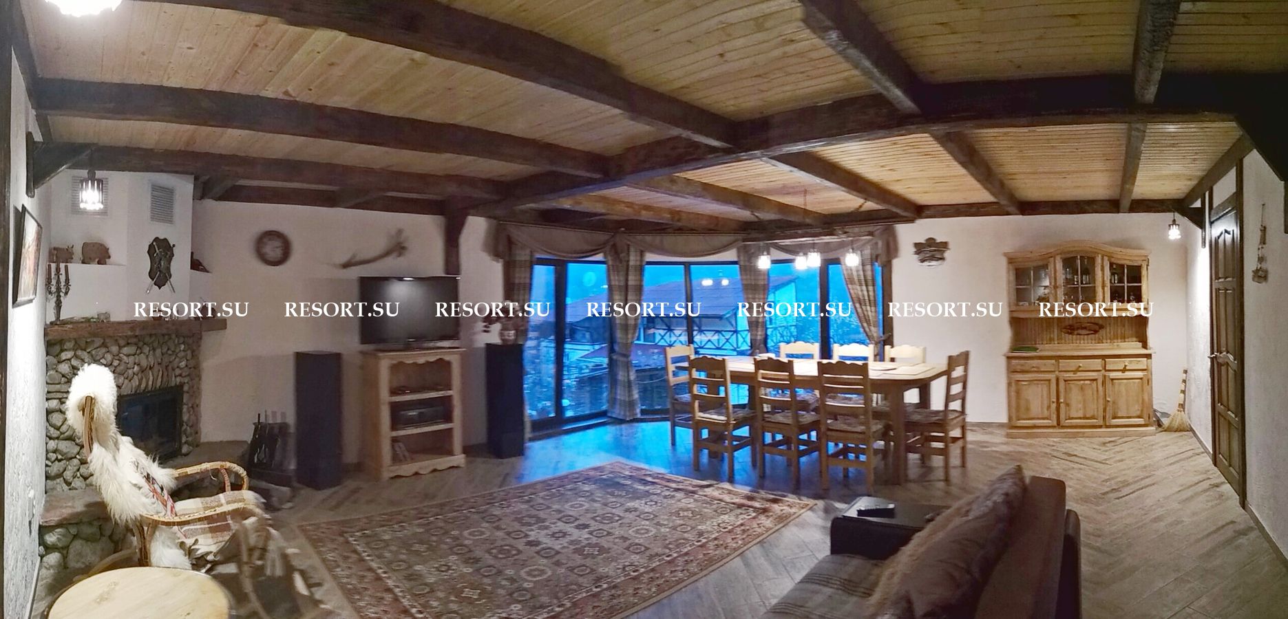 На первом этаже каминный зал площадью 40 квадратных метров с большим дубовым обеденным столом, мягкой мебелью. Большие окна обеспечивают панорамный вид на горы. Телевизор со спутниковой антенной обеспечивает широкий выбор российских и украинских каналов. Мощная акустика, DVD-плейер.