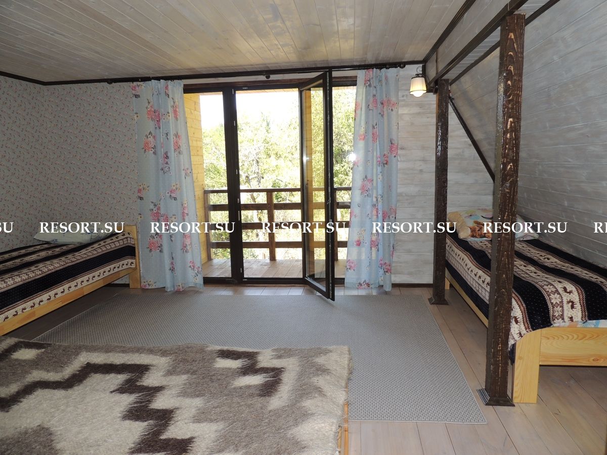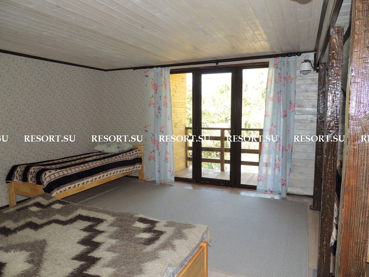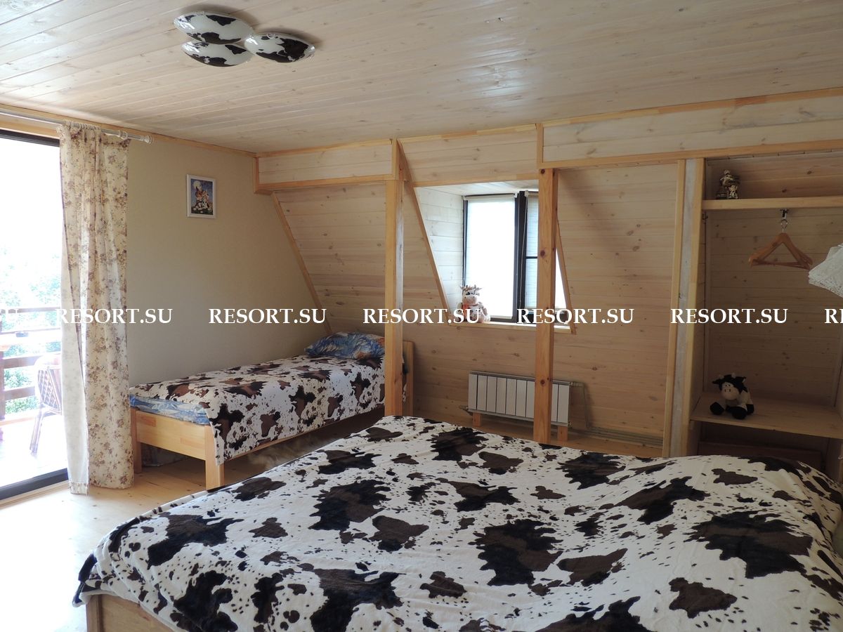 2-й этаж. Три спальни с двуспальными кроватями (есть места для детей ). Туалетная комната с душевой кабинкой. Большая лоджия 15 кв.м с очень красивым видом на горы и усадьбу (выход из 2-х спален).