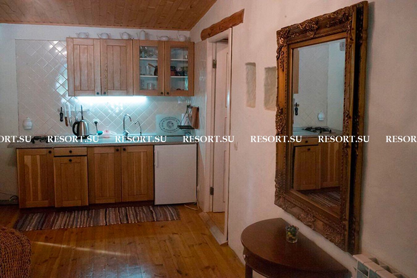 - Кухня с плитой, микроволновой печью, холодильником и посудой