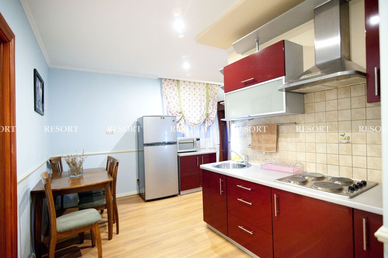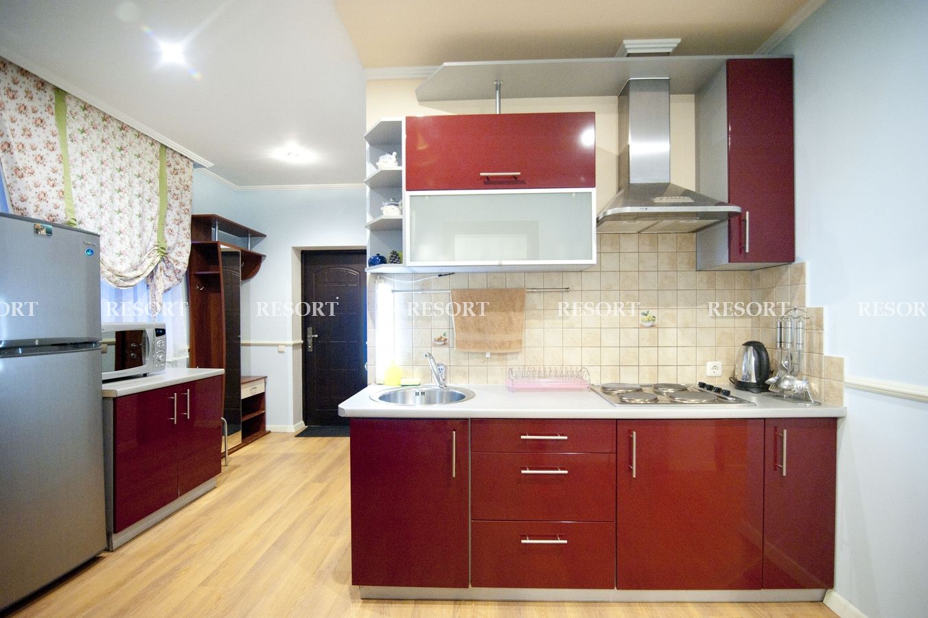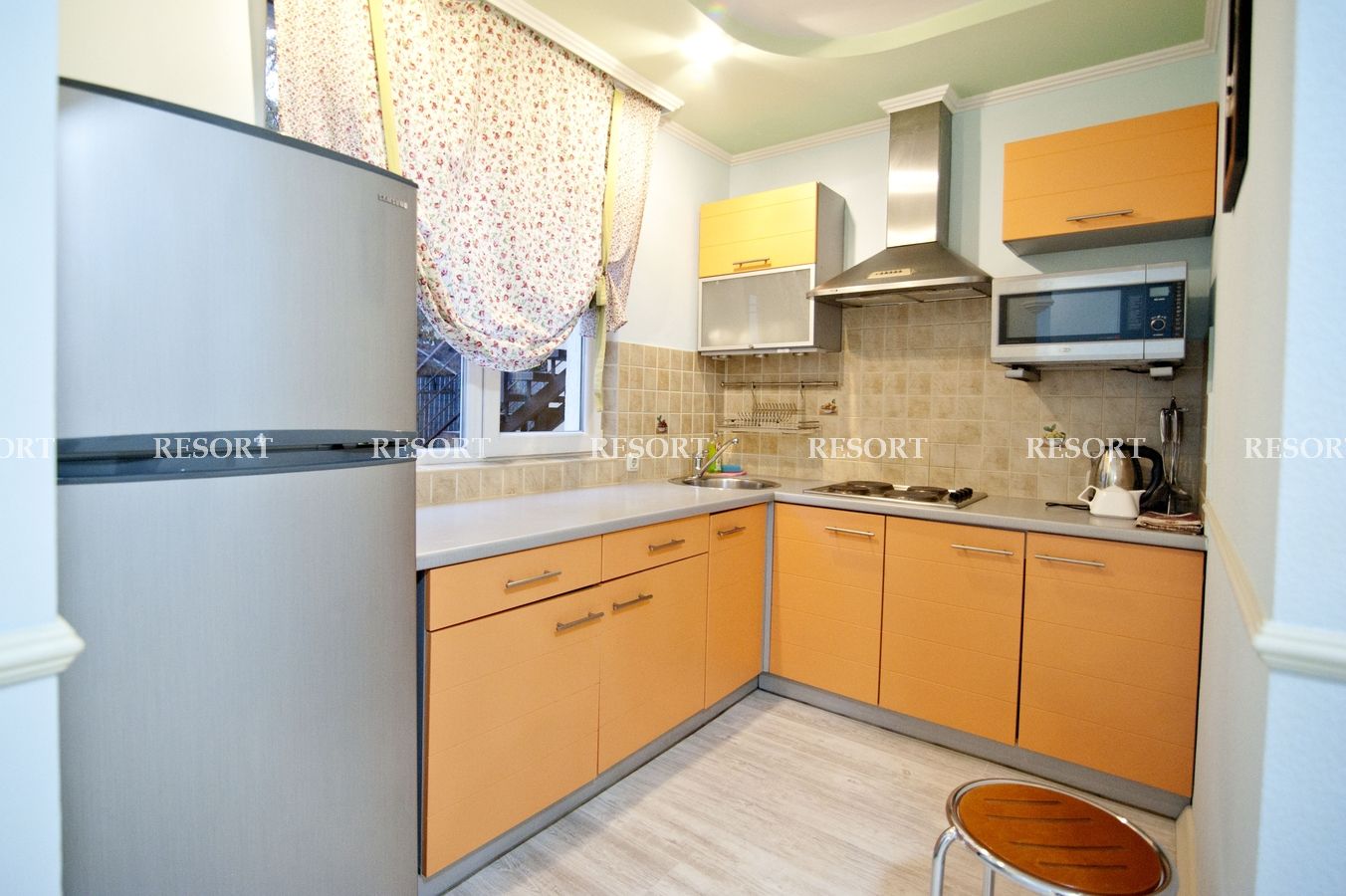 В кухне: эл.плита, холодильник, микроволновая печь, полный обьем посуды, эл.чайник, спутниковое телевидение, интернет.