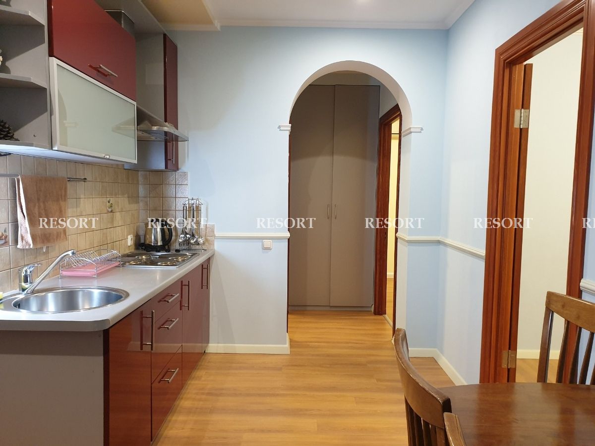 В апартаментах: две спальни и кухня-студия, совмещенная аркой с залом.